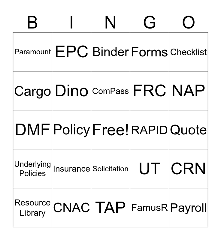 This bingo card has a free space and 24 words: Insurance, CNAC, ComPass, Resource Library, Checklist, Paramount, Cargo, EPC, RAPID, Solicitation, FRC, DMF, UT, CRN, Dino, FamusR, Quote, Binder, NAP, Policy, Payroll, Underlying Policies, Forms and TAP.