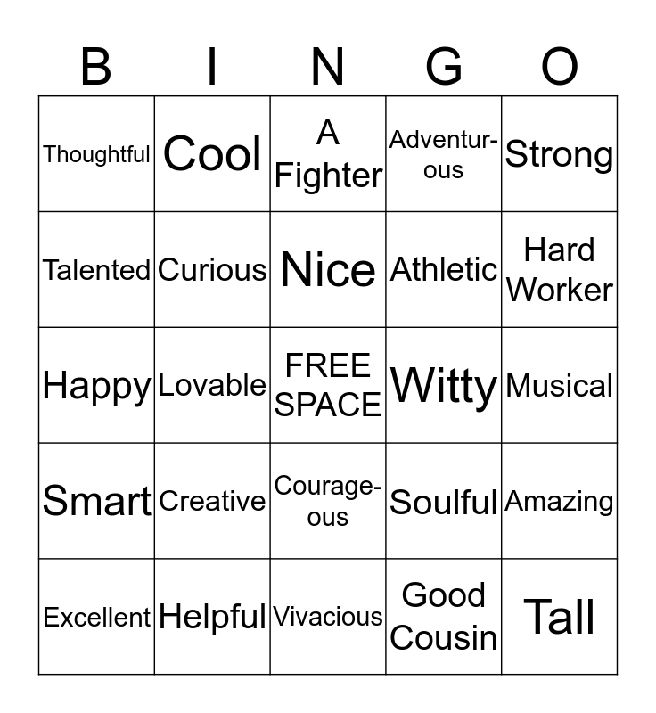 This bingo card has a free space and 28 words: Amazing, Kind, Athletic, Good Cousin, Talented, A Fighter, Cool, Smart, Witty, Excellent, Happy, Adventur-ous, Helpful, Vivacious, Hard Worker, Loyal, Creative, Curious, Nice, Courage-ous, Thoughtful, Artistic, Tall, Lovable, Musical, Soulful, Strong and Awesome.
