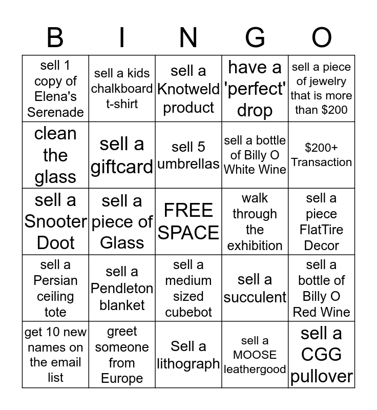 This bingo card has a free space and 24 words: sell a Pendleton blanket, greet someone from Europe, sell 5 umbrellas, get 10 new names on the email list, sell a piece of jewelry that is more than $200, sell 1 copy of Elena's Serenade, clean the glass, sell a kids chalkboard t-shirt, walk through the exhibition, sell a medium sized cubebot, sell a bottle of Billy O White Wine, sell a Snooter Doot, sell a succulent, sell a bottle of Billy O Red Wine, sell a giftcard, sell a MOOSE leathergood, sell a piece FlatTire Decor, sell a Knotweld product, $200+ Transaction, sell a piece of Glass, sell a CGG pullover, sell a Persian ceiling tote, have a 'perfect' drop and Sell a lithograph.