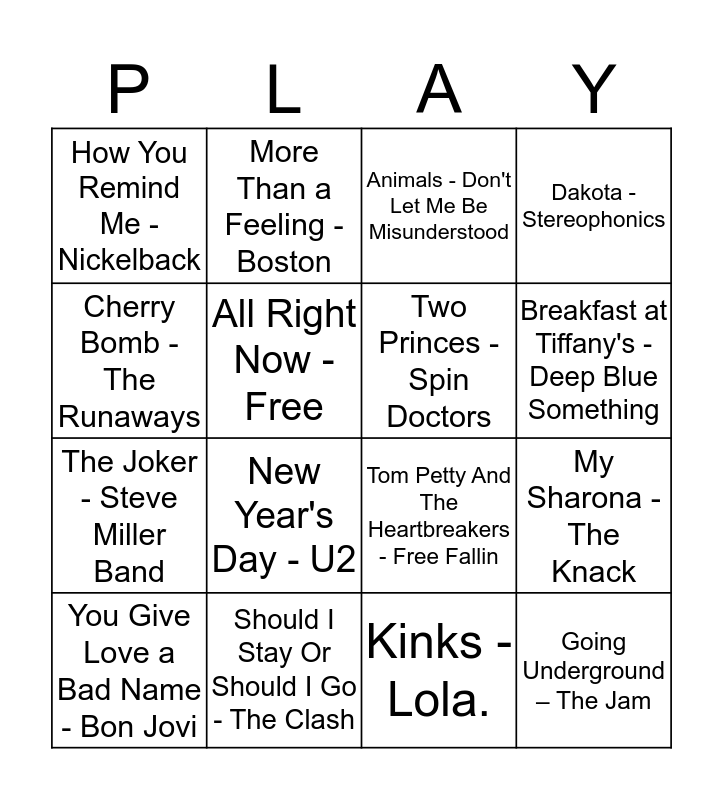 This bingo card has 50 words: We Will Rock You - Queen, You Give Love a Bad Name - Bon Jovi, You Really Got Me - The Kinks, Black Hole Sun - Soundgarden, Black Betty - Ram Jam, Eye of the Tiger - Survivor, More Than a Feeling - Boston, The Final Countdown – Europe, All Right Now - Free, Living After Midnight - Judas Priest, Two Princes - Spin Doctors, Dakota - Stereophonics, Since You Been Gone – Rainbow, Roxanne - The Police, Africa - Toto, Walk On the Wild Side - Lou Reed, Breakfast at Tiffany's - Deep Blue Something, Should I Stay Or Should I Go - The Clash, The Passenger - Iggy Pop, Cherry Bomb - The Runaways, My Sharona - The Knack, Love Is the Drug - Roxy Music, How You Remind Me - Nickelback, The Joker - Steve Miller Band, Something in the Air - Thunderclap Newman, Don't Bring Me Down - Electric Light Orchestra, New Year's Day - U2, America - A Horse With no Name, Animals - Don't Let Me Be Misunderstood, Animals - House of the Rising Sun, Billy Idol - White Wedding, Black Sabbath – Paranoid, Bob Dylan - Like a Rolling Stone, Eagles - One Of These Nights, Electric Light Orchestra - Livin' Thing, Fleetwood Mac - Everywhere., Fleetwood Mac - Go Your Own Way, Guns N' Roses - Sweet Child O' Mine, Jimi Hendrix - Hey Joe, Kinks - Lola., Led Zeppelin - Black Dog, Moody Blues - Nights In White Satin, Procol Harum - A Whiter Shade Of Pale, Supertramp - The Logical Song, The Rolling Stones - Let's Spend The Night Together, Tom Petty And The Heartbreakers - Free Fallin, With or without you – U2, Wild Thing – The Troggs, Going Underground – The Jam and Whitesnake – Here I go again.