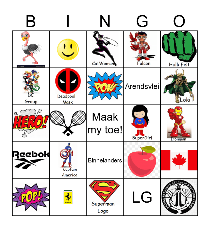 This bingo card has 67 images, a free space and 12 words: Suidooster, 7de Laan, Binnelanders, Arendsvlei, Isidingo, Generations, Samsung, Huawei, Nokia, LG, iPhone and Muvhango.