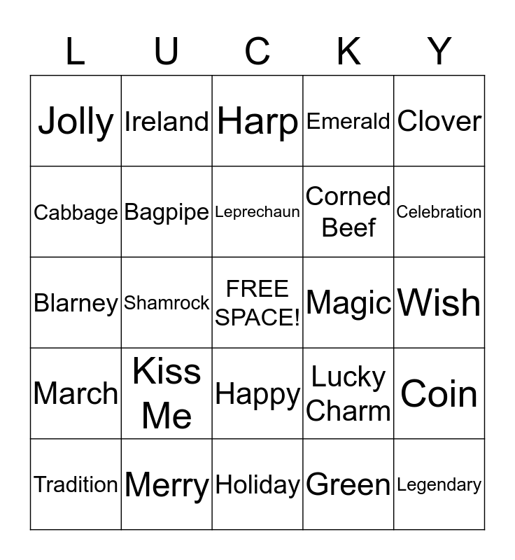 This bingo card has a free space and 32 words: Green, Pot of Gold, Shamrock, St.Patrick, March, Bagpipe, Clover, Coin, Ireland, Rainbow, Leprechaun, Harp, Irish, Luck, Magic, Seventeenth, Tradition, Blarney, Happy, Kiss Me, Lucky Charm, Spring, Wish, Merry, Legendary, Emerald, Corned Beef, Cabbage, Jolly, Holiday, Imagination and Celebration.