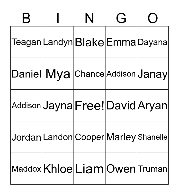This bingo card has a free space and 28 words: Shanelle, Breanna, Addison, Owen, Daniel, Blake, Landyn, Jordan, David, Maddox, Addison, Emma, Khloe, Liam, Janay, Nathen, Landon, Mya, Chance, Cooper, Teagan, Maida, Truman, Jayna, Aryan, Marley, Dayana and John.