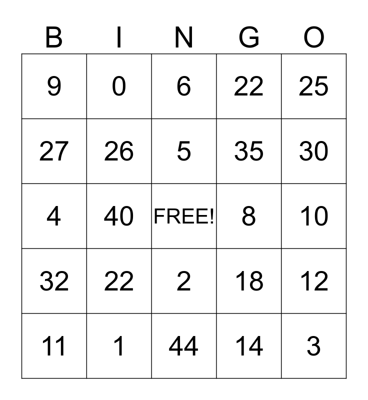 This bingo card has a free space and 24 words: 22, 1, 5, 11, 25, 9, 27, 0, 8, 2, 35, 4, 18, 12, 26, 14, 10, 6, 30, 40, 3, 32, 22 and 44.