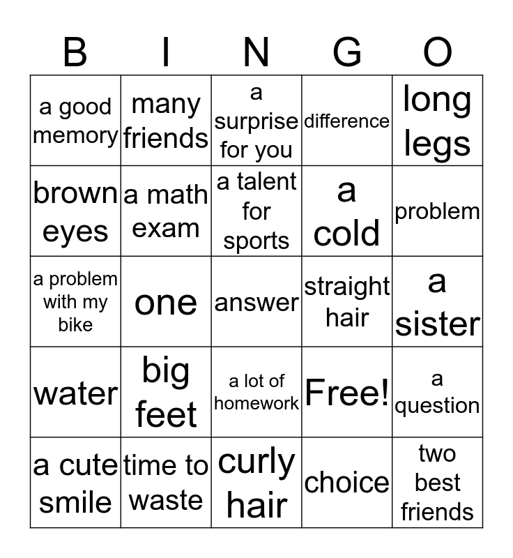 This bingo card has 25 words: big feet, curly hair, a talent for sports, a cute smile, long legs, a good memory, brown eyes, many friends, straight hair, a lot of homework, a cold, a problem with my bike, Free!, a question, a math exam, two best friends, a sister, a surprise for you, problem, one, answer, time to waste, water, difference and choice.
