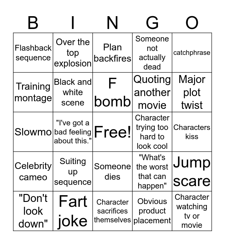 This bingo card has a free space and 26 words: Someone dies, Obvious product placement, F bomb, Fart joke, catchphrase, Flashback sequence, Training montage, Over the top explosion, Characters kiss, "What's the worst that can happen", Quoting another movie, Slowmo, Jump scare, "Don't look down", "I've got a bad feeling about this.", Villain monologue, Someone not actually dead, Celebrity cameo, Plan backfires, Character watching tv or movie, Major plot twist, Character sacrifices themselves, Character trying too hard to look cool, Suiting up sequence, Black and white scene and Made up science jargon.