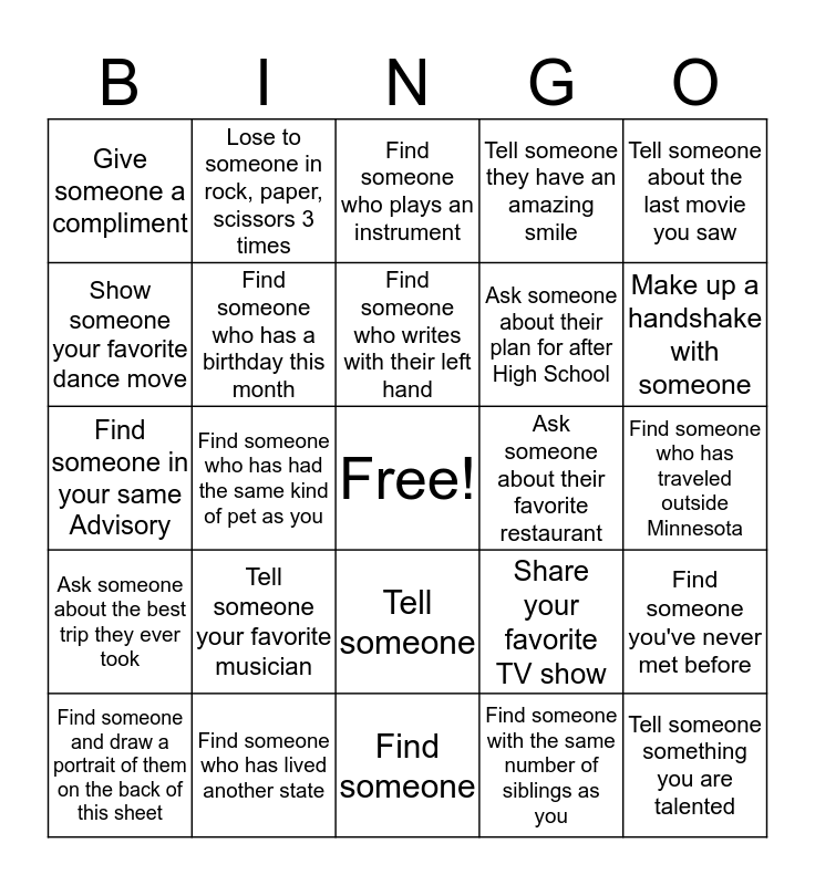 This bingo card has a free space and 24 words: Tell someone your favorite musician, Find someone who has lived another state, Find someone who writes with their left hand, Find someone and draw a portrait of them on the back of this sheet, Tell someone about the last movie you saw, Give someone a compliment, Show someone your favorite dance move, Lose to someone in rock, paper, scissors 3 times, Ask someone about their favorite restaurant, Tell someone, Ask someone about their plan for after High School, Find someone in your same Advisory, Share your favorite TV show, Find someone you've never met before, Find someone who has a birthday this month, Find someone with the same number of siblings as you, Find someone who has traveled outside Minnesota, Find someone who plays an instrument, Make up a handshake with someone, Find someone who has had the same kind of pet as you, Tell someone something you are talented, Ask someone about the best trip they ever took, Tell someone they have an amazing smile and Find someone.