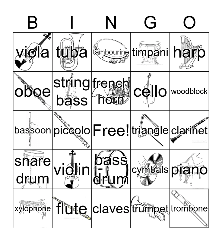 This bingo card has 22 images, a free space and 24 words: violin, flute, french horn, xylophone, harp, viola, oboe, tuba, triangle, bass drum, cello, bassoon, cymbals, piano, string bass, trumpet, clarinet, tambourine, woodblock, piccolo, trombone, snare drum, timpani and claves.