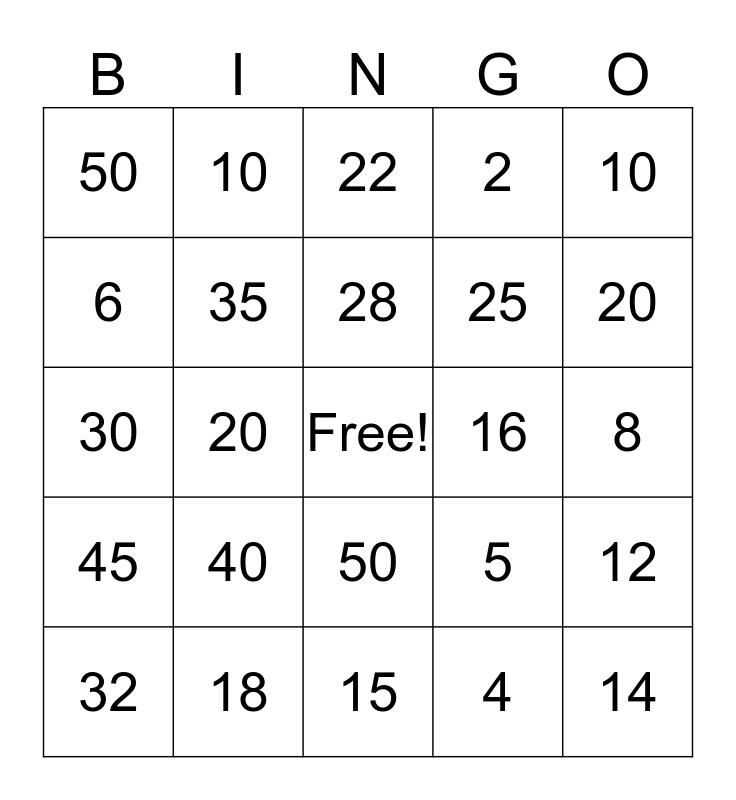 This bingo card has a free space and 27 words: 5, 12, 25, 15, 6, 22, 10, 45, 16, 12, 30, 2, 32, 18, 20, 24, 35, 28, 40, 50, 8, 4, 20, 14, 50, 10 and 26.