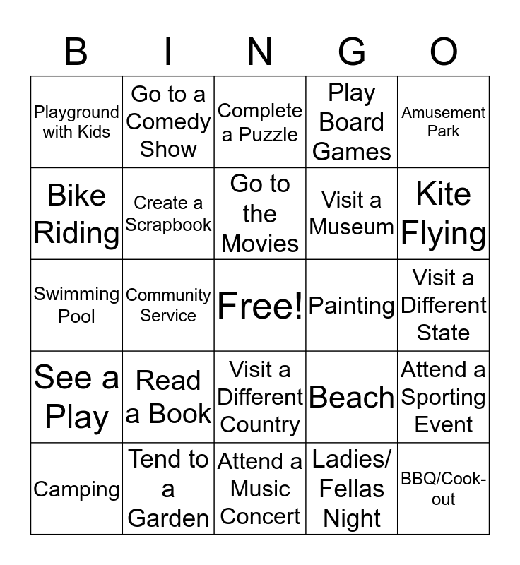 This bingo card has a free space and 24 words: Read a Book, Tend to a Garden, Go to the Movies, Camping, Amusement Park, Playground with Kids, Bike Riding, Go to a Comedy Show, Painting, Visit a Different Country, Visit a Museum, Swimming Pool, Beach, Attend a Sporting Event, Create a Scrapbook, Ladies/ Fellas Night, Visit a Different State, Complete a Puzzle, Kite Flying, Community Service, BBQ/Cook-out, See a Play, Play Board Games and Attend a Music Concert.