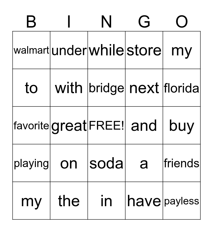 This bingo card has a free space and 32 words: have, a, great, day, playing, with, my, friends, under, the, bridge, while, eating, chips, and, drinking, my, favorite, soda, on, a, blanket, buy, the, payless, store, next, to, walmart, in, lakeland and florida.