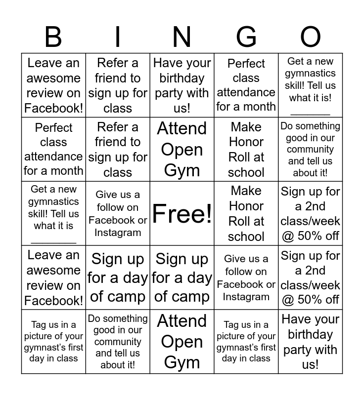 ⚠ This card has duplicate items: Sign up for a day of camp (2), Do something good in our community and tell us about it! (2), Attend Open Gym (2), Tag us in a picture of your gymnast’s first day in class (2), Leave an awesome review on Facebook! (2), Perfect class attendance for a month (2), Refer a friend to sign up for class (2), Make Honor Roll at school (2), Give us a follow on Facebook or Instagram (2), Sign up for a 2nd class/week @ 50% off (2), Have your birthday party with us! (2)