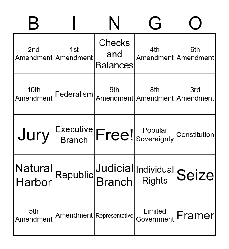 This bingo card has a free space and 30 words: Amendment, delegated, Executive Branch, Principle, 2nd Amendment, Checks and Balances, Federalism, Judicial Branch, Popular Sovereignty, Representative, Constitution, Framer, Limited Government, Separation of Powers, 3rd Amendment, Bill of Rights, Individual Rights, Natural Harbor, Republic, 6th Amendment, Jury, Legislative Branch, 1st Amendment, 8th Amendment, 10th Amendment, 4th Amendment, Seize, 5th Amendment, 9th Amendment and Sovereignty.