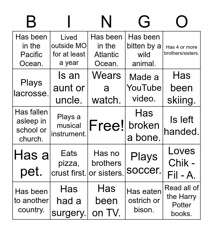 This bingo card has a free space and 24 words: Eats pizza, crust first., Has had a surgery., Wears a watch., Has been to another country., Has 4 or more brothers/sisters., Has been in the Pacific Ocean., Plays lacrosse., Lived outside MO for at least a year, Has broken a bone., Has no brothers or sisters., Made a YouTube video., Has fallen asleep in school or church., Plays soccer., Loves Chik - Fil - A., Is an aunt or uncle., Has eaten ostrich or bison., Is left handed., Has been in the Atlantic Ocean., Has been skiing., Plays a musical instrument., Read all of the Harry Potter books., Has a pet., Has been bitten by a wild animal. and Has been on TV..