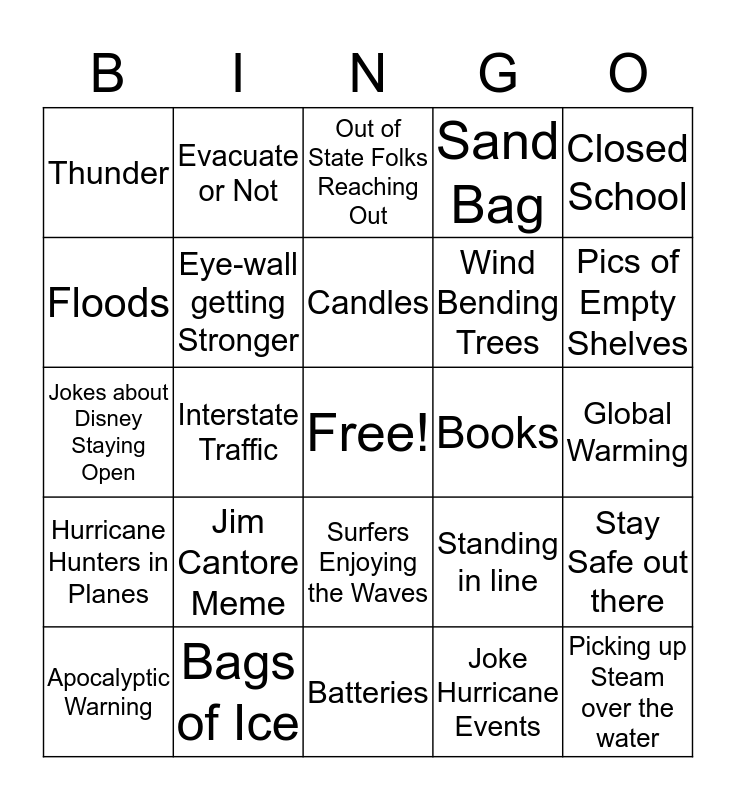 This bingo card has a free space and 46 words: Out of Gas, Picking up Steam over the water, Pull out Cash, Batteries, Jim Cantore Meme, Hunker Down, Evacuate or Not, What Cat is it?, Floods, Getting Alcohol, Eye-wall getting Stronger, Sand Bag, Stay Safe out there, Standing in line, Dorian Gray Reference, People being a-holes b/c they are scared, Candles, Books, Hurricane Parties, Closed School, Interstate Traffic, Joke Hurricane Events, Thunder, Wind Bending Trees, Jokes About FEMA, Pics of Empty Shelves, Apocalyptic Warning, Not Being Able to Hear the Reporter, Surfers Enjoying the Waves, Hurricane Hunters in Planes, Flying Objects, Evacuation Plan, Don't Leave unless it's an Emergency, Make sure you have a Radio, Nut Butters, Bags of Ice, Global Warming, Storm Surge, Running out of Generators, Running out of Plywood, Washing Machine Beer Cooler, Out of State Folks Reaching Out, Jokes about Disney Staying Open, Stay Dry, Out of Bottled Water and Waffle House Still Open?.