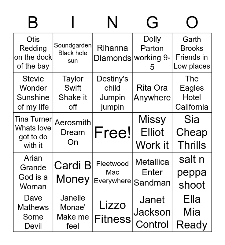 This bingo card has a free space and 29 words: Dave Mathews Some Devil, Jennifer Lopez Waiting for tonight, Aerosmith Dream On, TLC Waterfalls, Otis Redding on the dock of the bay, Rihanna Diamonds, Taylor Swift Shake it off, Cardi B Money, Missy Elliot Work it, Janelle Monae' Make me feel, Sia Cheap Thrills, Ella Mia Ready, Lizzo Fitness, Janet Jackson Control, The Eagles Hotel California, SZN Hoodie, Fleetwood Mac Everywhere, Arian Grande God is a Woman, Garth Brooks Friends in Low places, Tina Turner Whats love got to do with it, Metallica Enter Sandman, Selena Gomes It Ain't me, Rita Ora Anywhere, Stevie Wonder Sunshine of my life, Dolly Parton working 9-5, Soundgarden Black hole sun, salt n peppa shoot, Destiny's child Jumpin jumpin and Diana Ross upside down.