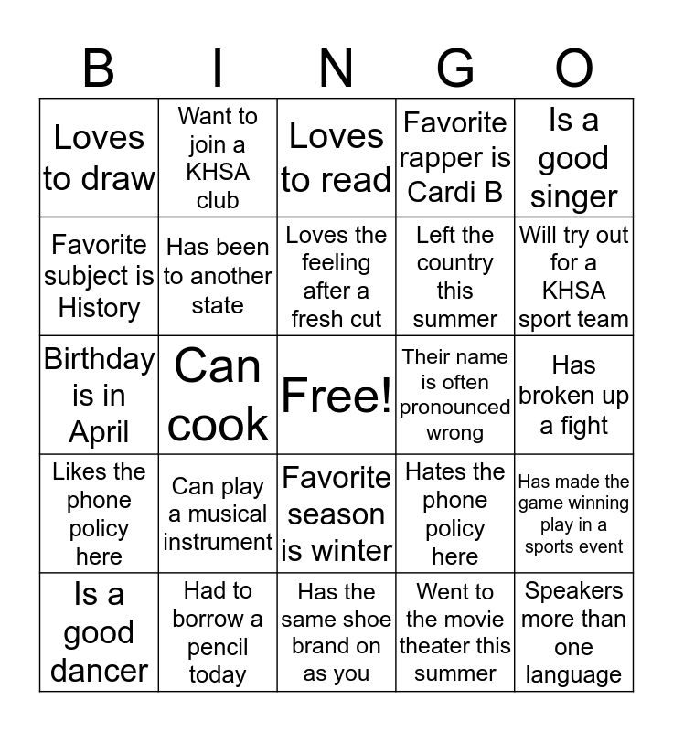 This bingo card has a free space and 24 words: Can play a musical instrument, Had to borrow a pencil today, Loves the feeling after a fresh cut, Is a good dancer, Is a good singer, Loves to draw, Favorite subject is History, Want to join a KHSA club, Their name is often pronounced wrong, Favorite season is winter, Left the country this summer, Birthday is in April, Hates the phone policy here, Has made the game winning play in a sports event, Has been to another state, Went to the movie theater this summer, Has broken up a fight, Loves to read, Will try out for a KHSA sport team, Can cook, Speakers more than one language, Likes the phone policy here, Favorite rapper is Cardi B and Has the same shoe brand on as you.
