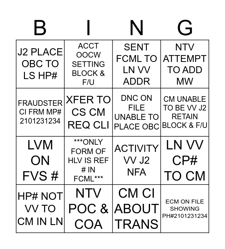 This bingo card has 16 words: NTV POC & COA, LN VV CP# TO CM, SENT FCML TO LN VV ADDR, J2 PLACE OBC TO LS HP#, LVM ON FVS #, ACCT OOCW SETTING BLOCK & F/U, ACTIVITY VV J2 NFA, CM CI ABOUT TRANS, FRAUDSTER CI FRM MP# 2101231234, XFER TO CS CM REQ CLI, HP# NOT VV TO CM IN LN, NTV ATTEMPT TO ADD MW, ***ONLY FORM OF HLV IS REF # IN FCML***, CM UNABLE TO BE VV J2 RETAIN BLOCK & F/U, DNC ON FILE UNABLE TO PLACE OBC and ECM ON FILE SHOWING PH#2101231234.