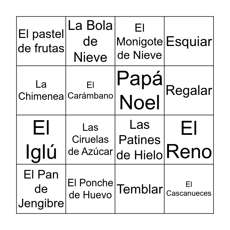 This bingo card has 20 words: El Reno, El Trineo, El Monigote de Nieve, El Artico, El Pan de Jengibre, La Chimenea, El Ponche de Huevo, El pastel de frutas, El Iglú, La Bola de Nieve, Las Ciruelas de Azúcar, Las Patines de Hielo, El Carámbano, El Cascanueces, Papá Noel, El Duende, Regalar, Esquiar, Temblar and Patinar.
