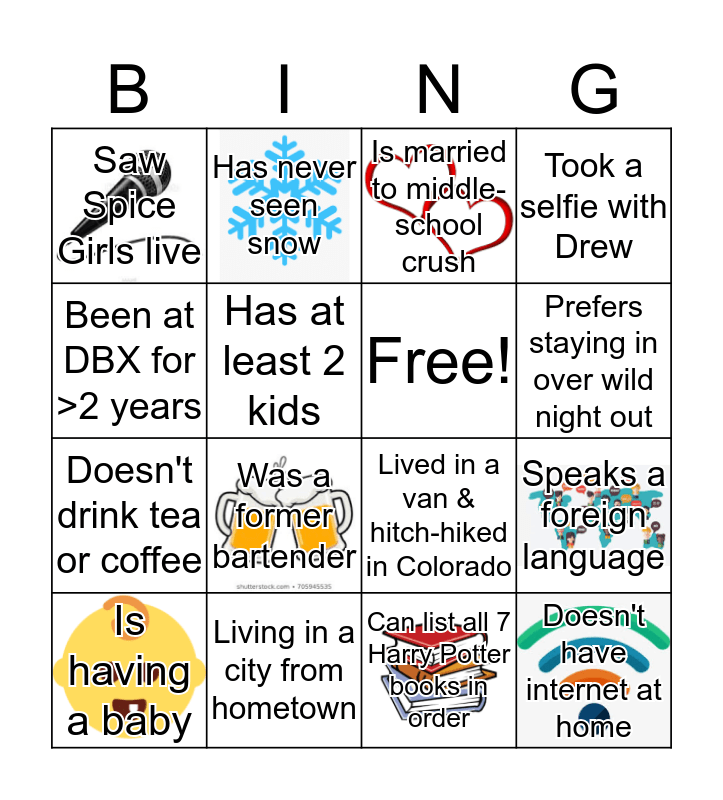 This bingo card has 8 images and 16 words: Is having a baby, Living in a city from hometown, Is married to middle-school crush, Took a selfie with Drew, Been at DBX for >2 years, Has never seen snow, Lived in a van & hitch-hiked in Colorado, Speaks a foreign language, Saw Spice Girls live, Has at least 2 kids, Can list all 7 Harry Potter books in order, Prefers staying in over wild night out, Doesn't drink tea or coffee, Was a former bartender, Free! and Doesn't have internet at home.
