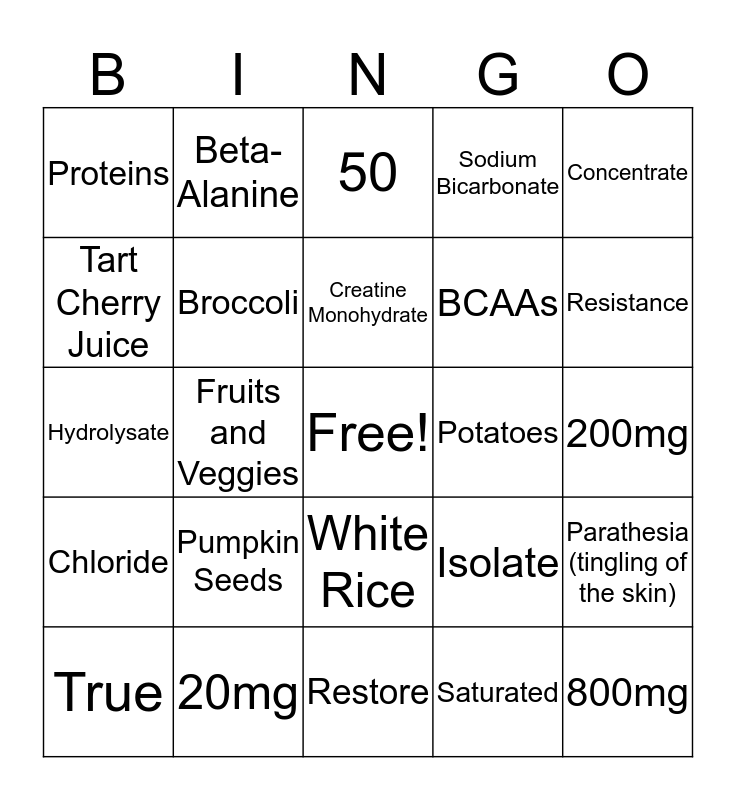 This bingo card has a free space and 29 words: True, False, Fruits and Veggies, Carbs, Proteins, 50, Broccoli, Pumpkin Seeds, Potatoes, 20mg, 200mg, 800mg, Restore, Saturated, Resistance, 60, White Rice, Chloride, Concentrate, Hydrolysate, Isolate, L-glutamine, BCAAs, Tart Cherry Juice, Sodium Bicarbonate, Beta-Alanine, Parathesia (tingling of the skin), Creatine Monohydrate and HMB.
