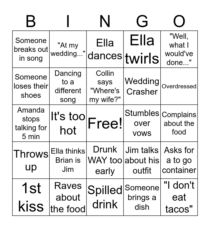 This bingo card has a free space and 29 words: 1st kiss, Complains about the weather, It's too hot, It's too cold, Someone breaks out in song, Ella dances, Dancing to a different song, Ella thinks Brian is Jim, Stumbles over vows, Raves about the food, Complains about the food, "I don't eat tacos", Spilled drink, Someone brings a dish, Overdressed, Underdressed, Drunk WAY too early, Throws up, "Well, what I would've done...", Amanda stops talking for 5 min, Jim talks about his outfit, Passerby yells, Wedding Crasher, Someone loses their shoes, Ella twirls, "At my wedding...", Asks for a to go container, Collin says "Where's my wife?" and Audrey says "Where's my hubby?".