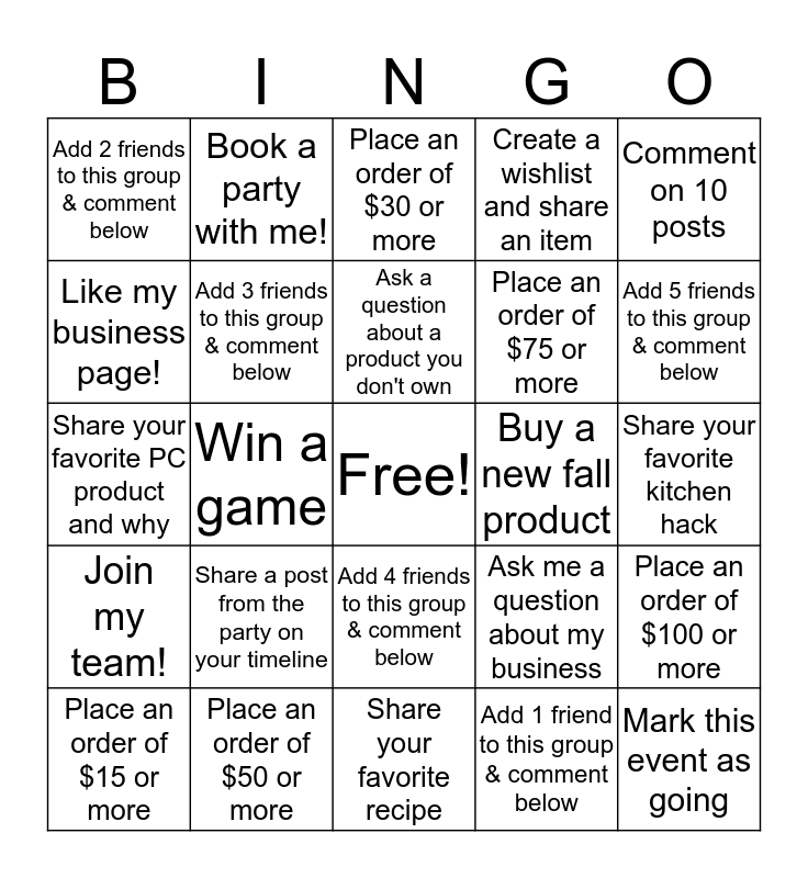 This bingo card has a free space and 24 words: Place an order of $15 or more, Share a post from the party on your timeline, Ask a question about a product you don't own, Add 1 friend to this group & comment below, Comment on 10 posts, Add 2 friends to this group & comment below, Book a party with me!, Place an order of $30 or more, Buy a new fall product, Share your favorite kitchen hack, Share your favorite PC product and why, Add 3 friends to this group & comment below, Ask me a question about my business, Place an order of $100 or more, Like my business page!, Place an order of $50 or more, Share your favorite recipe, Create a wishlist and share an item, Add 5 friends to this group & comment below, Join my team!, Win a game, Add 4 friends to this group & comment below, Place an order of $75 or more and Mark this event as going.