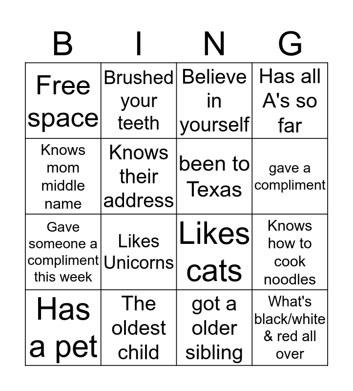 This bingo card has 16 words: The oldest child, Knows how to cook noodles, Believe in yourself, Free space, Gave someone a compliment this week, Brushed your teeth, Likes cats, got a older sibling, Knows mom middle name, Knows their address, Has a pet, Has all A's so far, Likes Unicorns, gave a compliment, been to Texas and What's black/white & red all over.