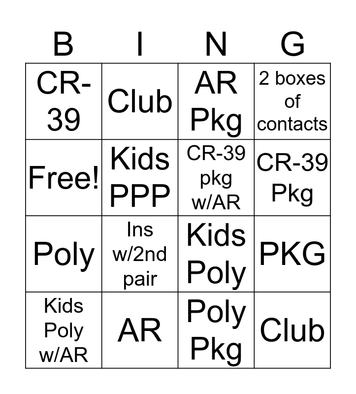 This bingo card has 16 words: AR, PKG, AR Pkg, CR-39, Poly, Club, Kids Poly, Poly Pkg, Free!, Kids PPP, Kids Poly w/AR, 2 boxes of contacts, Ins w/2nd pair, CR-39 Pkg, CR-39 pkg w/AR and Club.