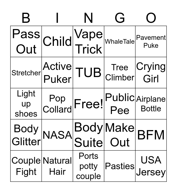 This bingo card has a free space and 24 words: NASA, Natural Hair, TUB, Couple Fight, Pavement Puke, Pass Out, Stretcher, Child, Public Pee, Body Suite, Tree Climber, Light up shoes, Make Out, BFM, Active Puker, Pasties, Airplane Bottle, Vape Trick, Crying Girl, Pop Collard, USA Jersey, Body Glitter, WhaleTale and Ports potty couple.