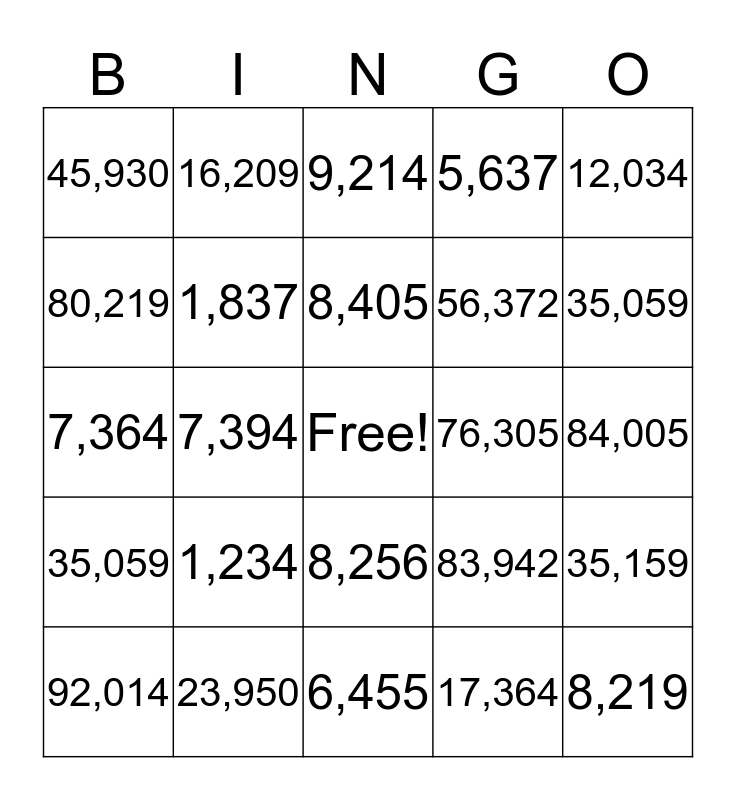 This bingo card has a free space and 24 words: 1,234, 23,950, 8,405, 92,014, 12,034, 45,930, 80,219, 16,209, 76,305, 8,256, 56,372, 7,364, 83,942, 35,159, 1,837, 17,364, 84,005, 9,214, 35,059, 7,394, 8,219, 35,059, 5,637 and 6,455.