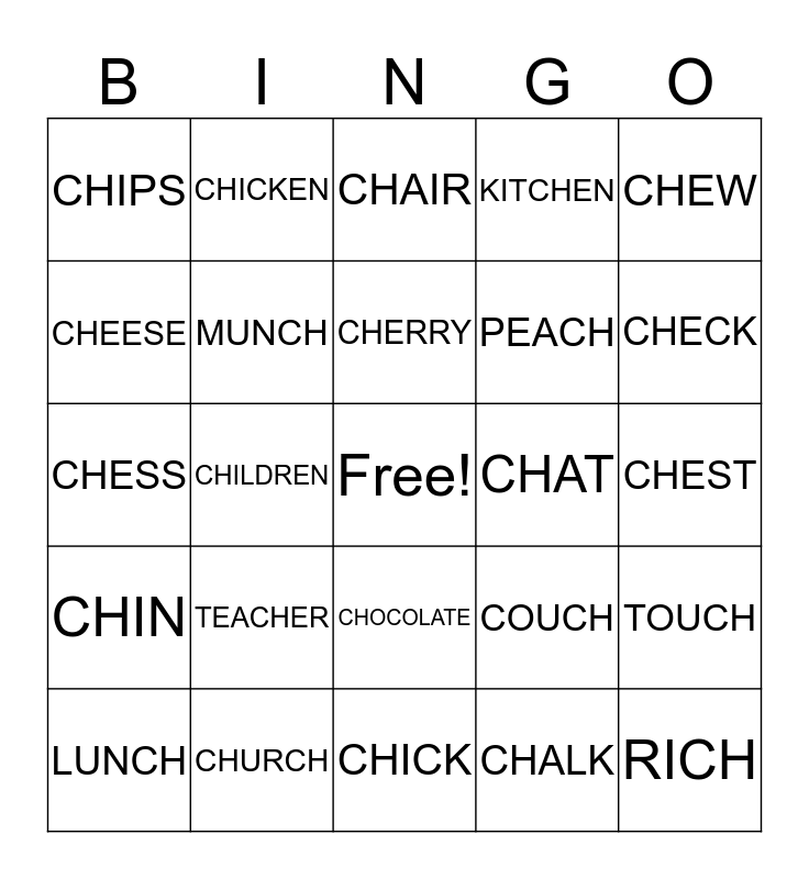 This bingo card has a free space and 24 words: LUNCH, TEACHER, CHERRY, CHALK, CHEW, CHIPS, CHICKEN, CHAIR, CHAT, CHEST, CHESS, MUNCH, COUCH, TOUCH, CHEESE, CHURCH, CHICK, KITCHEN, CHECK, CHIN, CHILDREN, CHOCOLATE, PEACH and RICH.