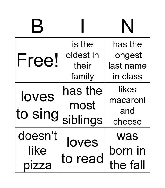 This bingo card has 9 words: doesn't like pizza, has the longest last name in class, is the oldest in their family, loves to sing, Free!, likes macaroni and cheese, has the most siblings, was born in the fall and loves to read.