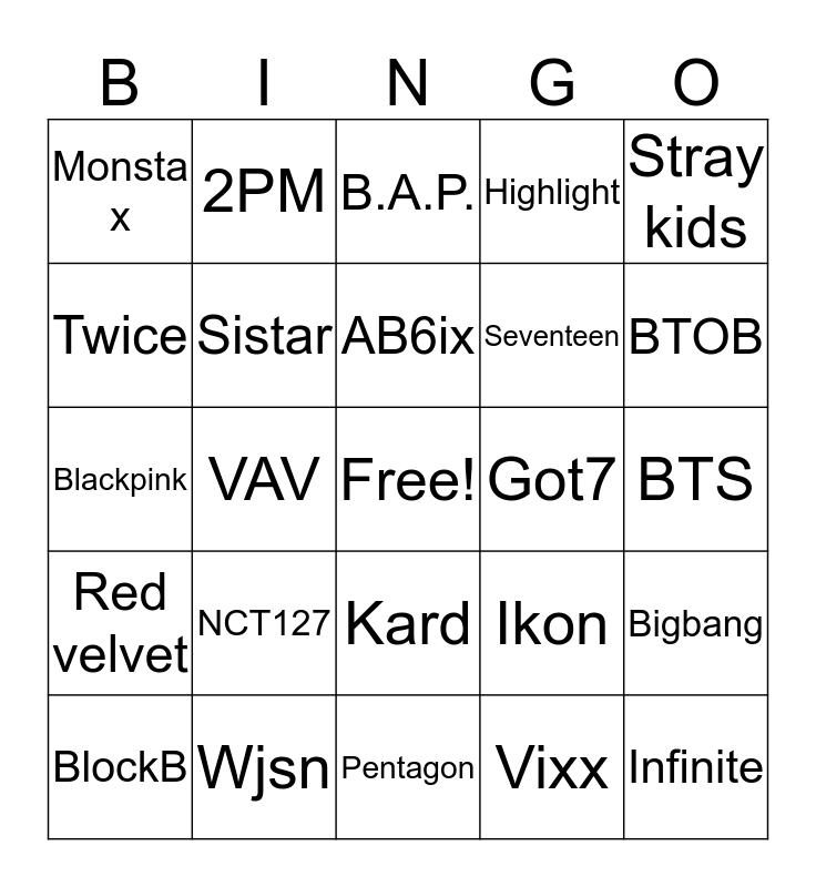 This bingo card has a free space and 29 words: BlockB, Mamamoo, VAV, GFriend, Monsta x, B.A.P., Sistar, NCT127, Got7, Wjsn, BTS, Infinite, Pentagon, Vixx, BTOB, Itzy, Kard, Red velvet, Stray kids, Blackpink, Ikon, Loona, Seventeen, Twice, Highlight, 2PM, Bigbang, AB6ix and Shinee.