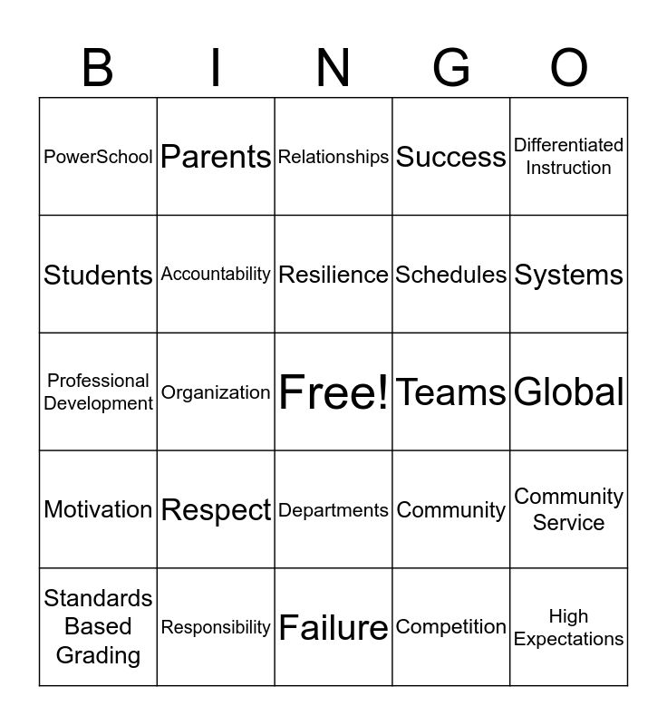 This bingo card has a free space and 24 words: Respect, Responsibility, Resilience, Standards Based Grading, Differentiated Instruction, PowerSchool, Students, Parents, Teams, Departments, Schedules, Professional Development, Community, Community Service, Accountability, Competition, Global, Relationships, Systems, Organization, High Expectations, Motivation, Success and Failure.