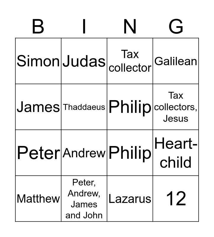 This bingo card has 29 words: A little girl, His mother, Heart-child, Sons of Thunder, Simon, Tax collector, Philip, Thomas, Peter, Andrew, James and John, Bartholomew, Lazarus, Matthew, Peter, James and John, Andrew, Mother-in-law, John, 12, James, Philip, Andrew, Pigs, Peter, Thaddaeus, Galilean, Judas, James, Tax collectors, Jesus and 30.