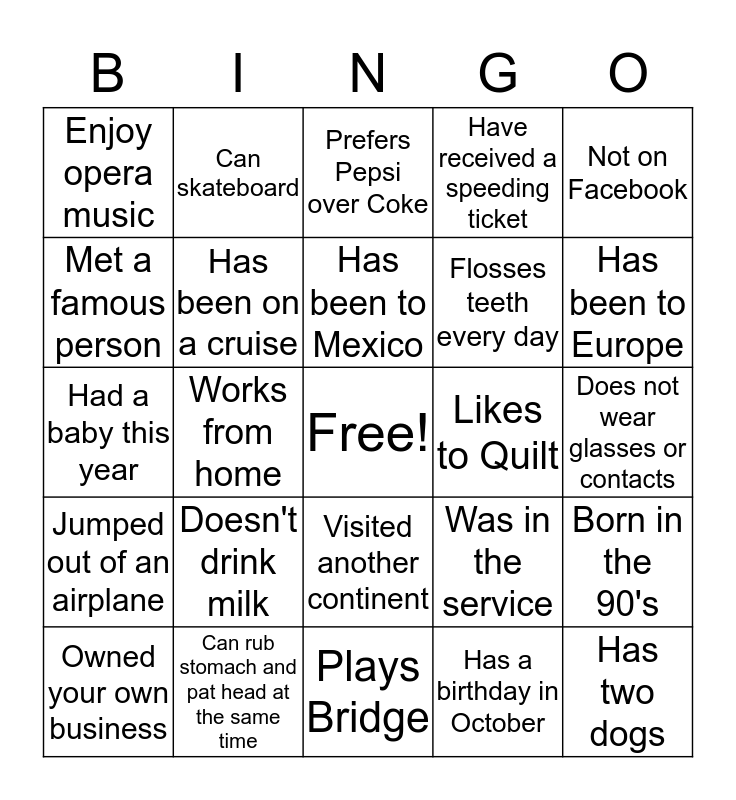 This bingo card has a free space and 54 words: Plays a musical instrument, Jumped out of an airplane, Milked a cow with own hands, Can speak a foreign language, Visited another continent, Picture has been in newspaper, Have received a speeding ticket, Can ride a bicycle, Met a famous person, Hit a homerun in a baseball game, Enjoy opera music, Dislikes chocolate, Can rub stomach and pat head at the same time, Owned your own business, Gone on a mission trip, Plays Bridge, Has two dogs, Flosses teeth every day, Loves to Garden, Does not wear glasses or contacts, Was in the service, Been to Atlantic and Pacific Oceans, Likes to Quilt, Not on Facebook, Likes to hike, Can skateboard, Is the oldest or only child, Can name seven dwarfs, Loves to watch football, Has a birthday in October, Can Juggle, Is younger than 10, Has run a triathlon, Drives a minivan, Prefers Pepsi over Coke, Has been married at least 20 years, Had a baby this year, Born in the 90's, Left handed, Has been on a cruise, Owns a white car, Is over 6' tall, Has never had a broken bone, Has painted toenails, Doesn't drink milk, Has been on a motorcycle, Can salsa dance, Drives a truck, Has been to Mexico, Works from home, Has been to Europe, Has curly hair, Has dance the "Chicken Dance" and Has been to an outdoor rock concert.