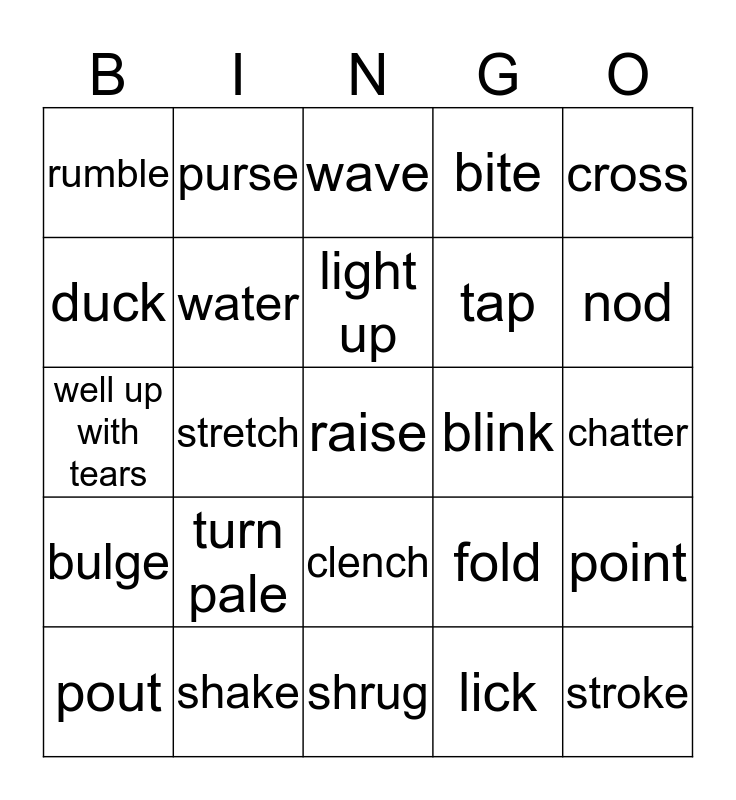 This bingo card has a free space and 24 words: turn pale, shake, light up, pout, cross, rumble, duck, purse, blink, clench, tap, well up with tears, fold, point, water, lick, chatter, wave, nod, stretch, stroke, bulge, bite and shrug.