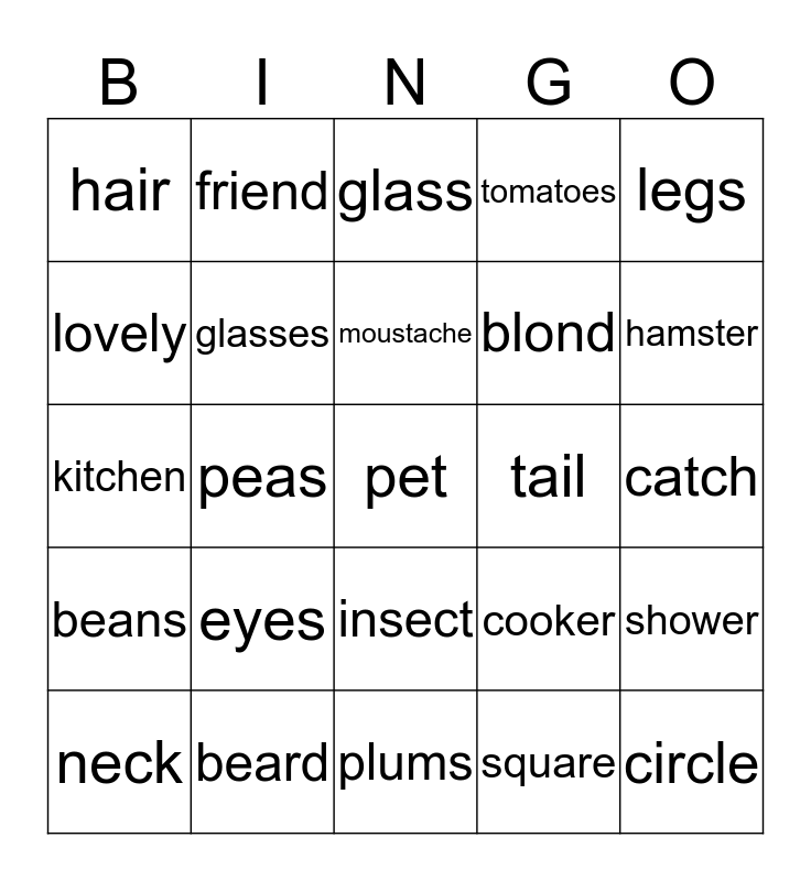 This bingo card has a free space and 24 words: eyes, beard, moustache, neck, legs, hair, lovely, friend, tail, insect, blond, kitchen, cooker, shower, glasses, square, catch, glass, hamster, peas, circle, beans, tomatoes and plums.