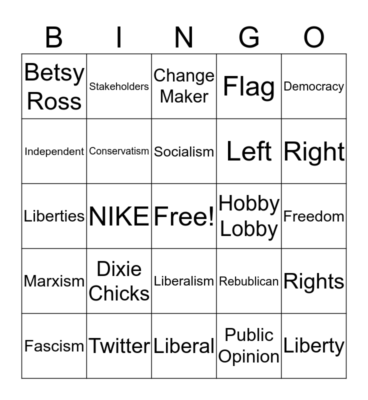 This bingo card has a free space and 39 words: Anarchism, Absolutism, Communism, Conservatism, Fascism, Liberalism, Socialism, Capitalism, Democracy, Marxism, NIKE, Flag, Liberty, Freedom, Hobby Lobby, Dixie Chicks, Nine Line, Betsy Ross, Democrat, Rebublican, Independent, Liberal, Left, Right, populism, Authoritarianism, Monarchy, Profit, Capital, Stakeholders, Shareholders, CEO, Change Maker, Twitter, Public Opinion, Freedom of Speech, Rights, Liberties and Ethics.