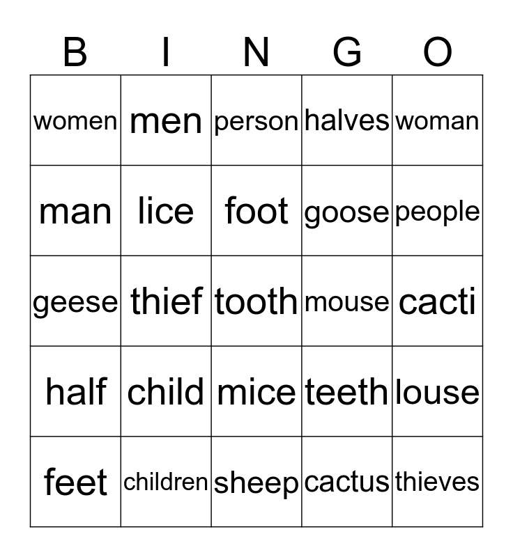 This bingo card has a free space and 24 words: child, children, foot, feet, woman, women, man, men, mouse, mice, goose, geese, teeth, louse, lice, cactus, cacti, person, people, thief, thieves, half, halves and sheep.