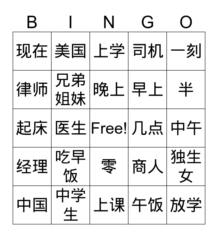 This bingo card has a free space and 29 words: 睡觉, 中学生, 上学, 老师, 一刻, 现在, 兄弟姐妹, 晚上, 几点, 独生女, 中国, 医生, 午饭, 放学, 起床, 工作, 上课, 商人, 半, 经理, 吃早饭, 护士, 早上, 中午, 律师, 美国, 零, 司机 and 上学.