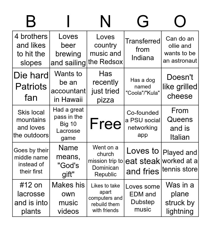 This bingo card has a free space and 24 words: Name means, "God's gift", Makes his own music videos, Has recently just tried pizza, #12 on lacrosse and is into plants, Can do an ollie and wants to be an astronaut, 4 brothers and likes to hit the slopes, Die hard Patriots fan, Loves beer brewing and sailing, Co-founded a PSU social networking app, Went on a church mission trip to Dominican Republic, Has a dog named "Coola"/"Kula", Skis local mountains and loves the outdoors, Loves to eat steak and fries, Played and worked at a tennis store, Wants to be an accountant in Hawaii, Loves some EDM and Dubstep music, From Queens and is Italian, Loves country music and the Redsox, Doesn't like grilled cheese, Had a great pass in the Big 10 Lacrosse game, Was in a plane struck by lightning, Goes by their middle name instead of their first, Transferred from Indiana and Likes to take apart computers and rebuild them with friends.