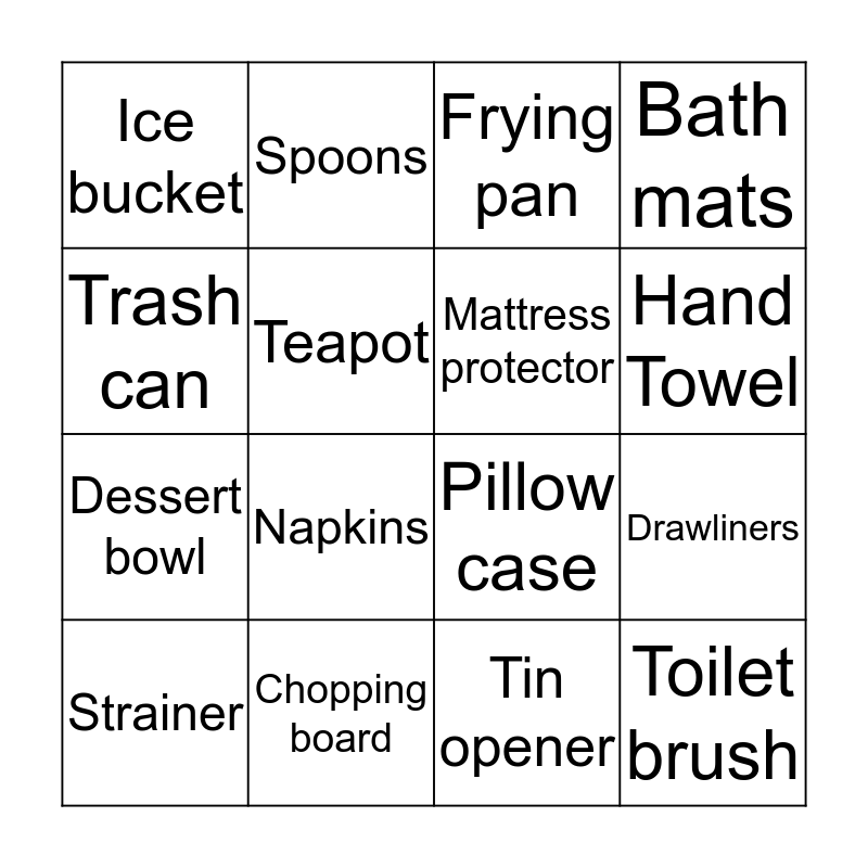 This bingo card has 40 words: Fitted sheet, Pillow case, Duvet Inner, Mattress protector, Pillow Protector, Bath Towel, Hand Towel, Bathroom bin, Trash can, Toilet brush, Drawliners, Bath mats, Strainer, Tin opener, Chopping board, Cleaning brush set, Dish rack, Ice bucket, Non-stick pan, Frying pan, Porridge Bowl, Dinnerset, Dessert bowl, Teapot, Sugar bowl, Cups and saucers, Mugs, Kitchen Canisters, Cake dome, Wine glass, Jug, Salad bowl/Server, Cake lifter, Serving Spoon, Napkins, Palcemats, Forks, Knives, Spoons and Vase.