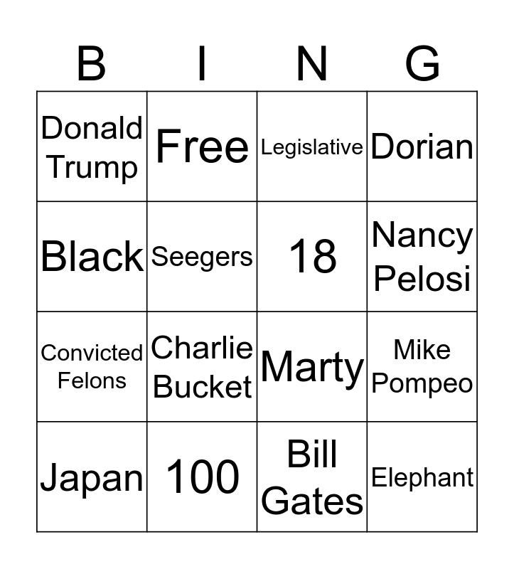 This bingo card has 24 words: Sept. 27, George, Nancy Pelosi, Donkey, Black, Donald Trump, Seegers, Free, 100, Joe Biden, Convicted Felons, Marty, 1920, Dinosaur, 18, 435, Bill Gates, Legislative, Charlie Bucket, Mike Pompeo, Japan, Elephant, Dorian and Beto O'Rourke.