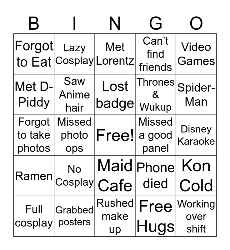 This bingo card has a free space and 24 words: No Cosplay, Grabbed posters, Lost badge, Full cosplay, Video Games, Forgot to Eat, Met D-Piddy, Lazy Cosplay, Missed a good panel, Maid Cafe, Thrones & Wukup, Forgot to take photos, Phone died, Kon Cold, Saw Anime hair, Free Hugs, Disney Karaoke, Met Lorentz, Spider-Man, Missed photo ops, Working over shift, Ramen, Can’t find friends and Rushed make up.