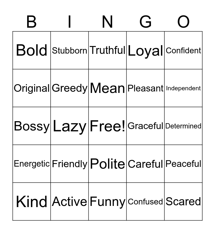 This bingo card has a free space and 24 words: Friendly, Active, Mean, Kind, Confident, Bold, Original, Stubborn, Graceful, Polite, Pleasant, Bossy, Careful, Peaceful, Greedy, Confused, Determined, Truthful, Independent, Lazy, Scared, Energetic, Loyal and Funny.