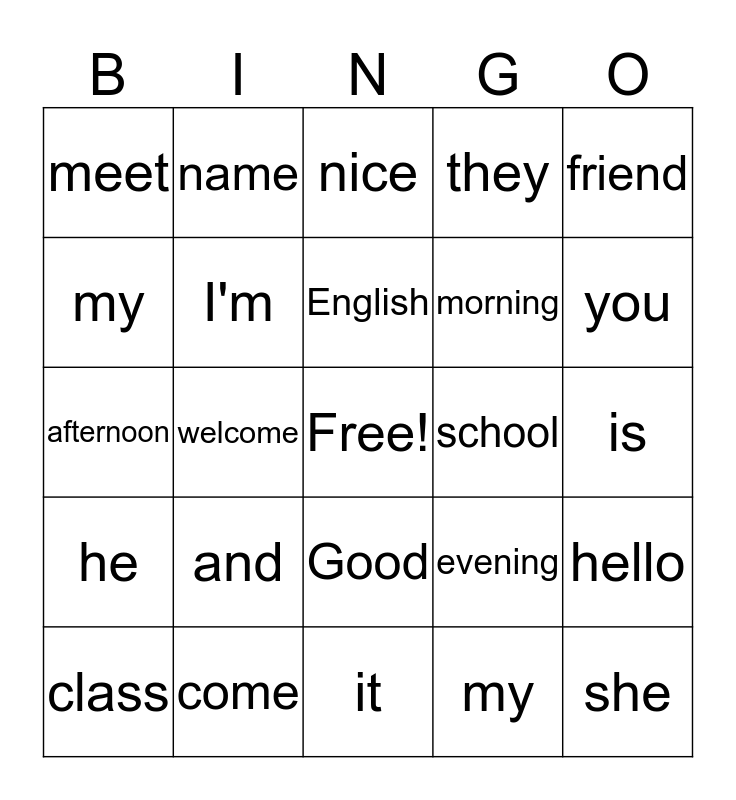 This bingo card has a free space and 24 words: and, come, English, class, friend, meet, my, name, school, Good, morning, afternoon, evening, hello, I'm, my, is, nice, you, welcome, she, he, they and it.