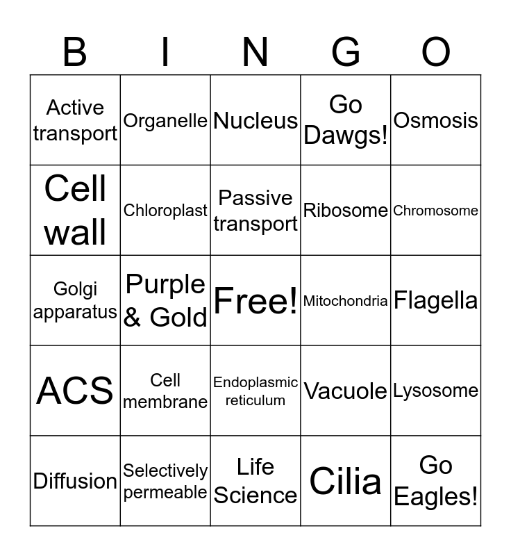 This bingo card has a free space and 24 words: Cell membrane, Selectively permeable, Passive transport, Diffusion, Osmosis, Active transport, Cell wall, Organelle, Mitochondria, Endoplasmic reticulum, Ribosome, Golgi apparatus, Vacuole, Lysosome, Chloroplast, Cilia, Flagella, Nucleus, Chromosome, Purple & Gold, Go Eagles!, ACS, Go Dawgs! and Life Science.