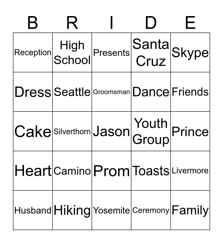 This bingo card has 50 words: Natalie, Jason, Wedding, Yosemite, Camino, Placerville, High School, Sweethearts, Dress, Love, Seattle, Santa Cruz, Livermore, Toasts, Kiss, Bridesmaid, Groomsman, Youth Group, Sushi, Skype, Silverthorn, Ceremony, Reception, Dance, Party, Family, Friends, Vows, Presents, Prom, Homecoming, Anniversary, Travel, Outdoors, Hiking, Forever, Honeymoon, White, Flowers, Prince, Happy, Ring, Engagement, Wife, Husband, Cake, Shower, Photos, Heart and Memories.